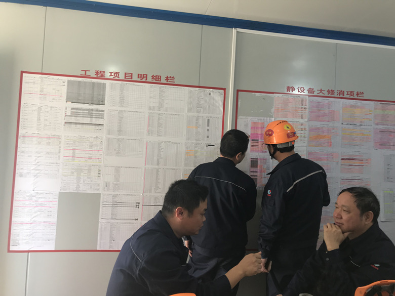 劉董事長一行從2#大門進(jìn)入裝置,映入眼簾的是一支支辛勤勞動、細(xì)致嚴(yán)謹(jǐn)?shù)臋z修隊(duì)伍。每當(dāng)經(jīng)過我公司將士檢修的裝置時,副指揮王建明就會一一介紹該區(qū)域總體的檢修內(nèi)容、參檢專業(yè)、當(dāng)前進(jìn)度和關(guān)鍵重點(diǎn)項(xiàng)目及困難點(diǎn)。對于現(xiàn)場標(biāo)準(zhǔn)化的作業(yè)和嚴(yán)格的安全管理,劉董事長頻頻點(diǎn)頭,并表示,檢修進(jìn)入關(guān)鍵時期,切記要強(qiáng)化管理,全局督查,全力以赴搞好此次檢修工作,確保安全、質(zhì)量、進(jìn)度全面受控。